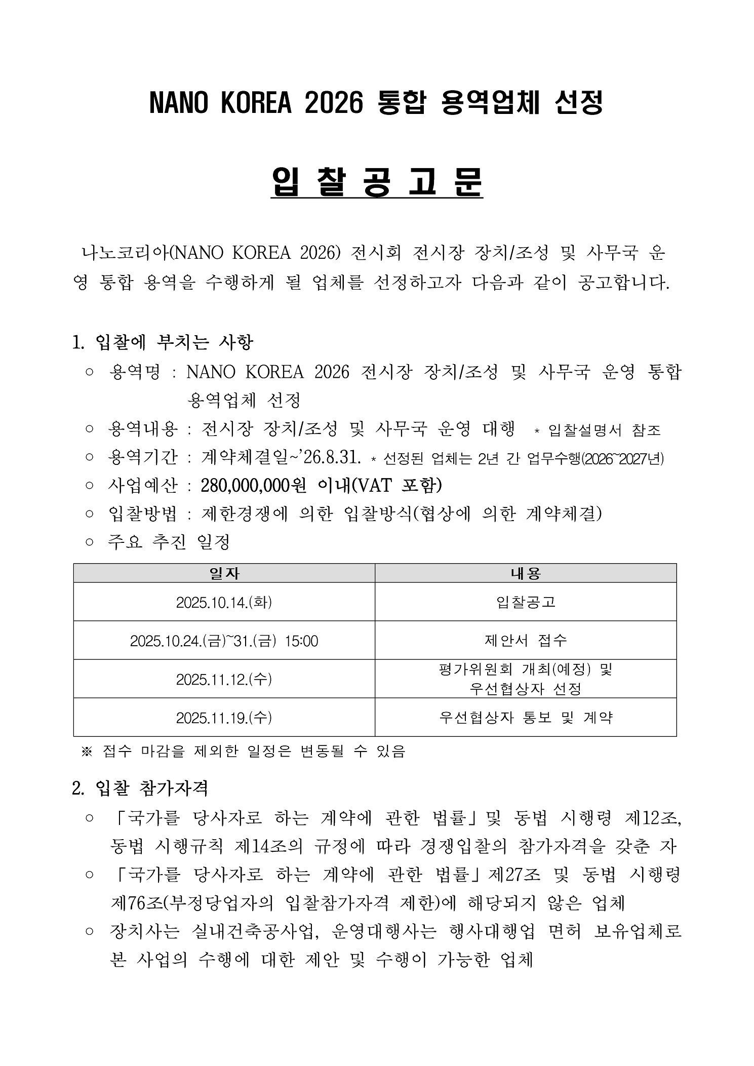[공지] [공고] NANO KOREA 2026 통합 용역업체 선정