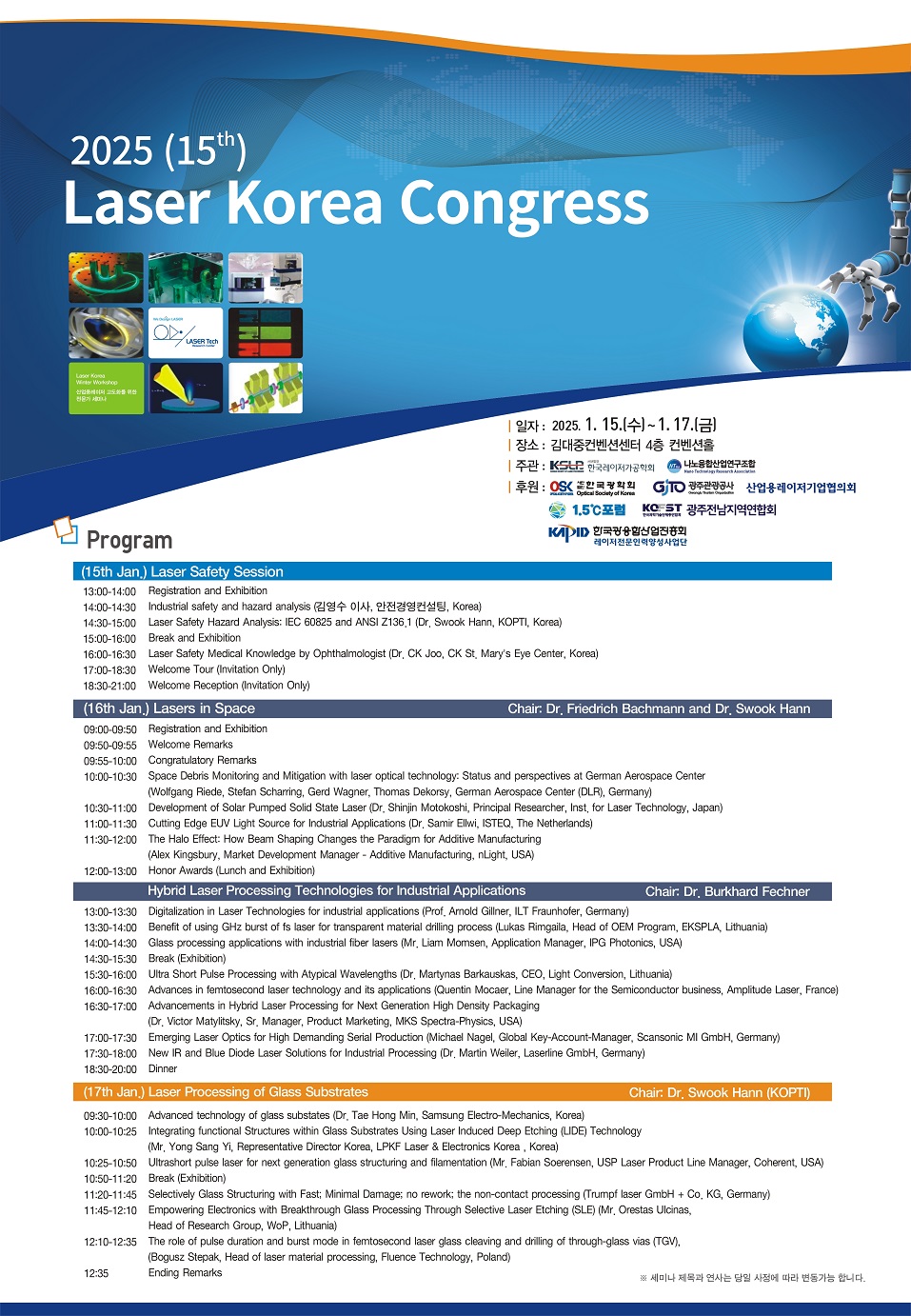 한국레이저가공학회와 나노융합산업연구조합은 매년 1월 광주에서 레이저코리아 콩그레스를 개최하고 있습니다. 내년에는 1월 15일(수)부터 17일(금)까지 3일간 광주 김대중컨벤션센터에서 2025 레이저코리아 콩그레스를 개최 할 예정입니다.