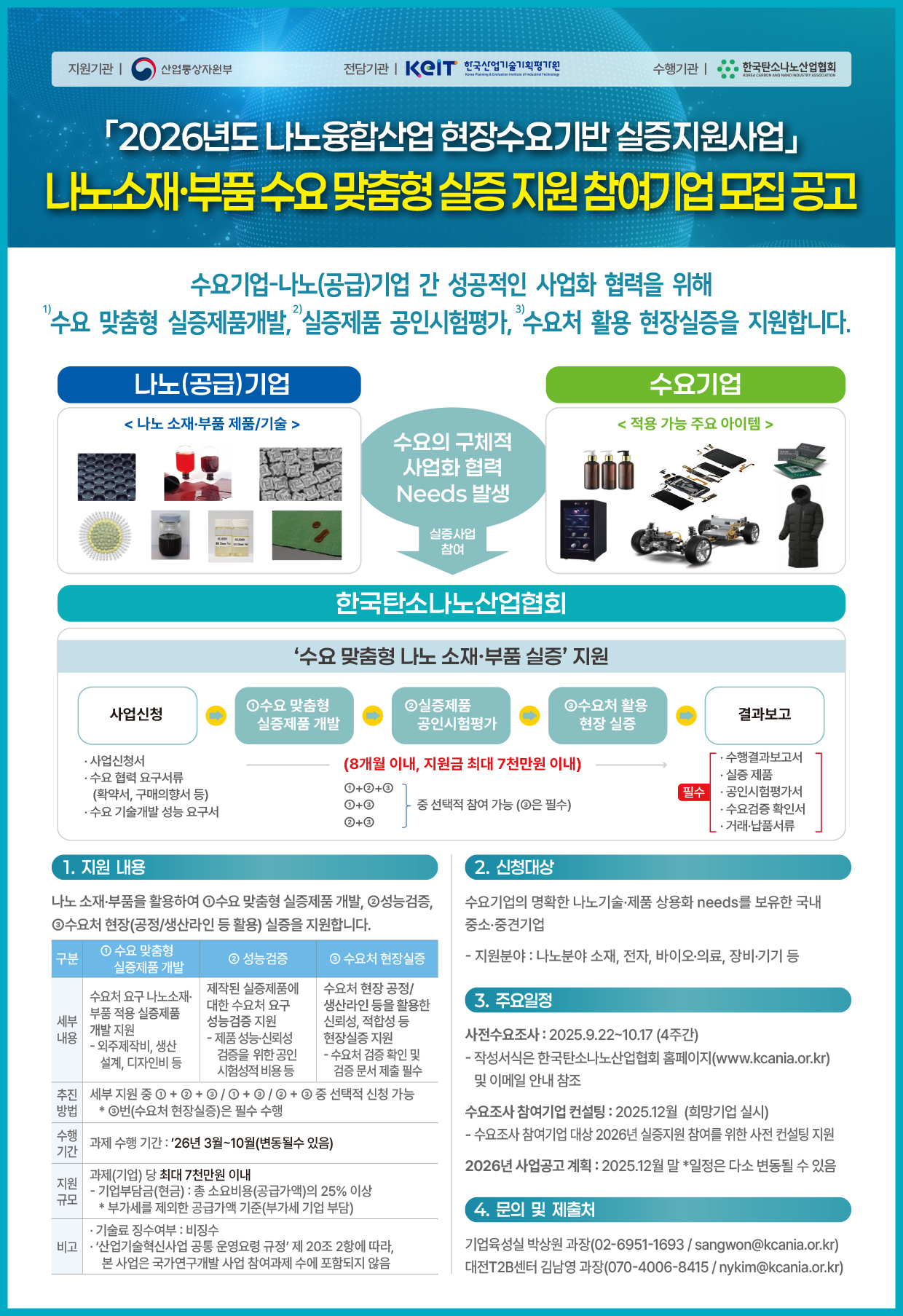 활용하여 ①제품개발 ②성능검증 ③수요처 현장 실증 지원 - 사업비 : 최대 7천만원 이내 - 사업기간 : 8개월 ('26. 3월 ~ 10 월) - 지원조건 : 수요기업의 needs를 보유한 나노기술·제품을 보유한 국내 중소·중견기업