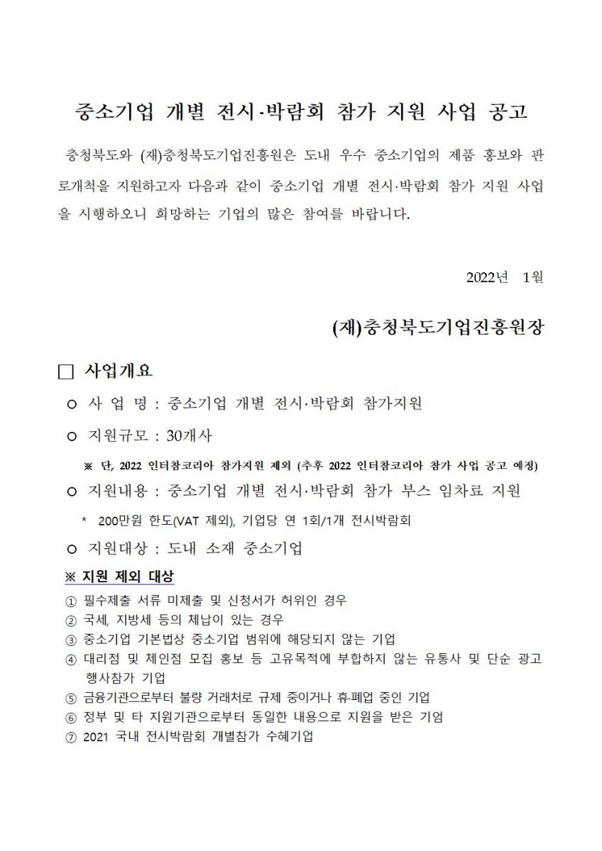 [마감][충청북도] 중소기업 개별 전시박람회 참가 지원사업 모집공고