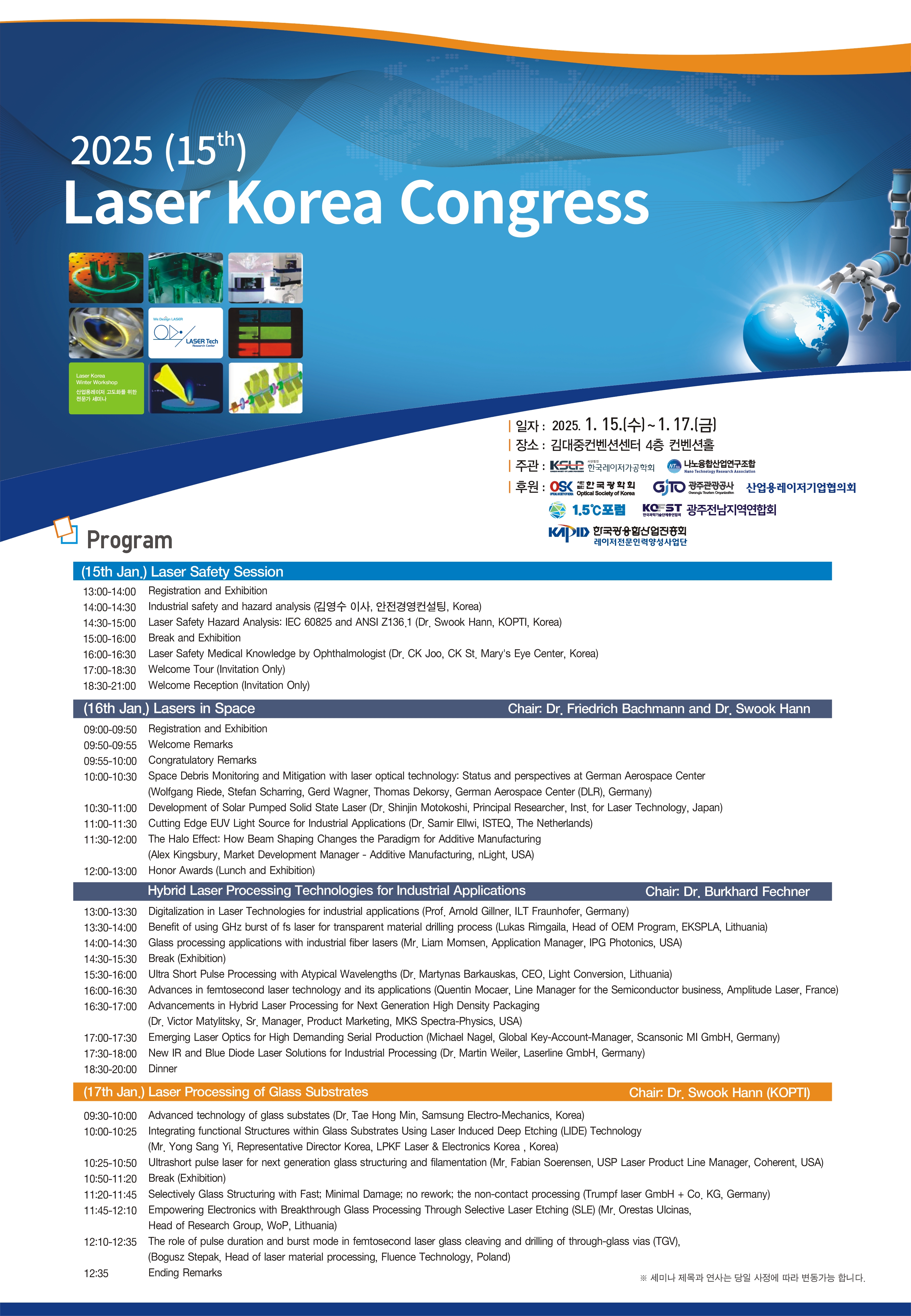 (1일차) Laser Safety Session (2일차) Laser in Space / Hybrid Laser Processing and In-suite Measurement Technologies (3일차) Laser Processing of Glass Substrates |