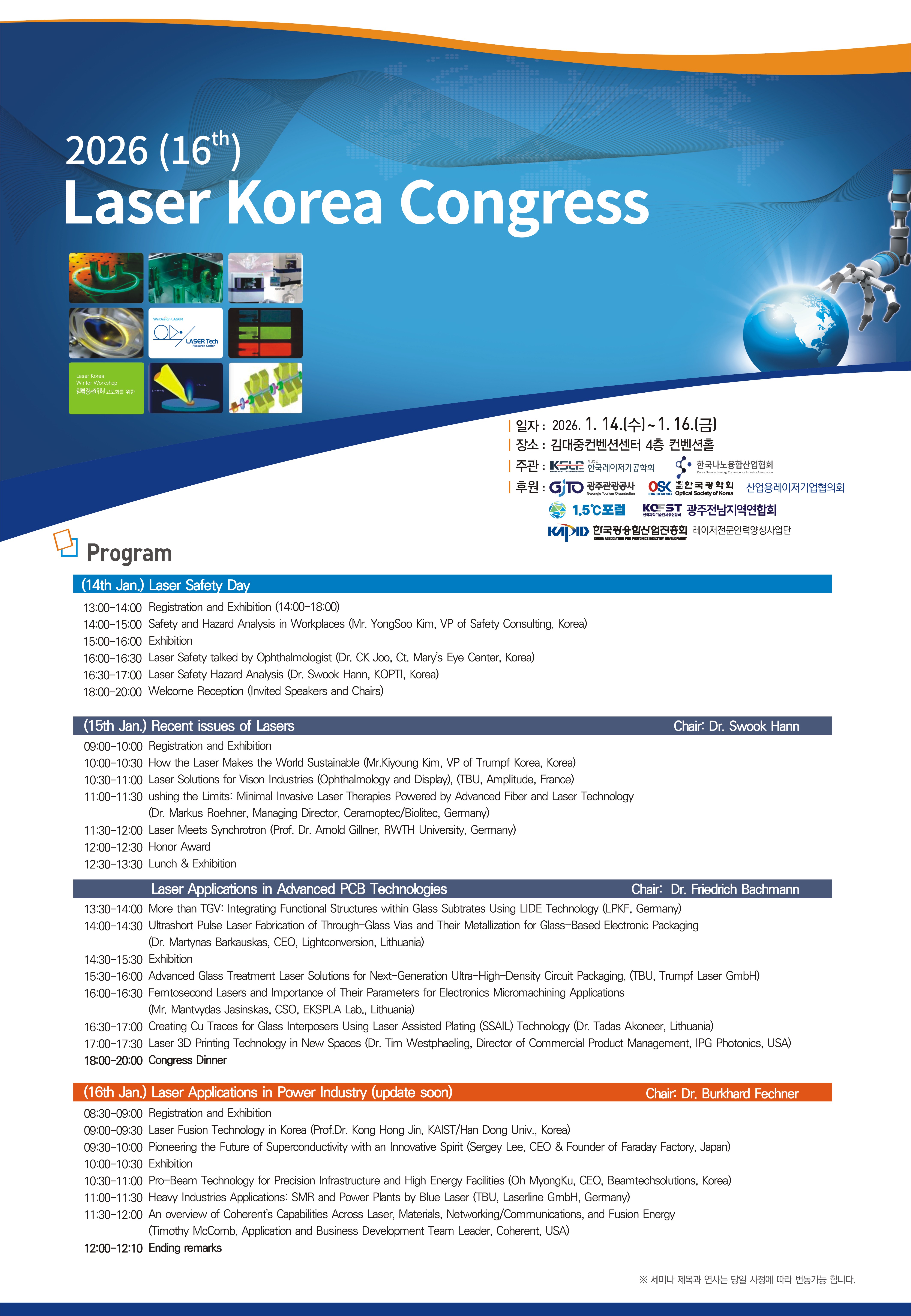 (1일차) Laser Safety Day (2일차) The ESG Contribution of Lasers / Laser Applicaitons in Advanced PCB Tehchnologies (3일차) Laser Applications in the Power Industry |